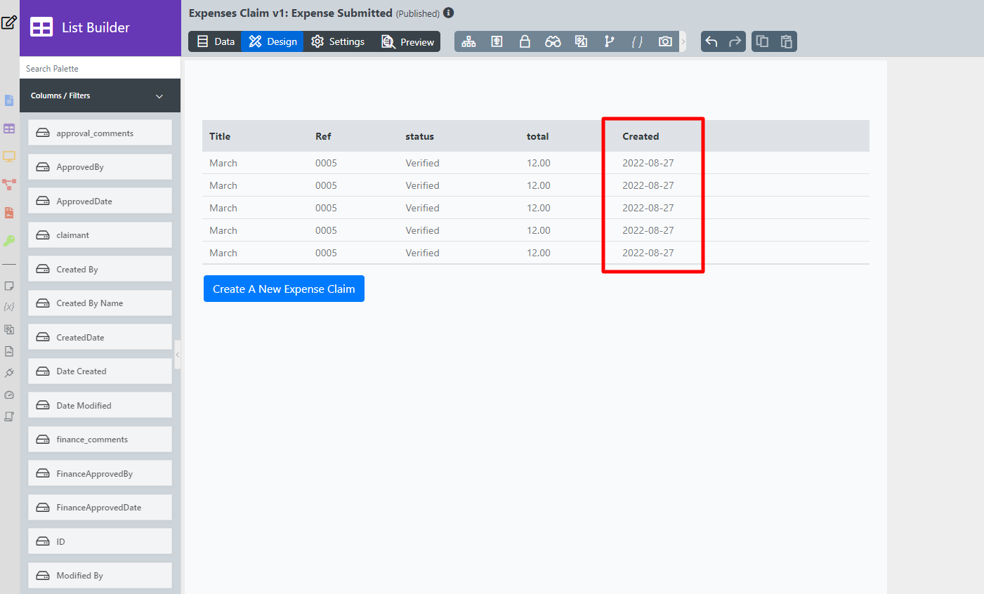 Figure 3: dateCreated is platform default column that will follow system locale format set
