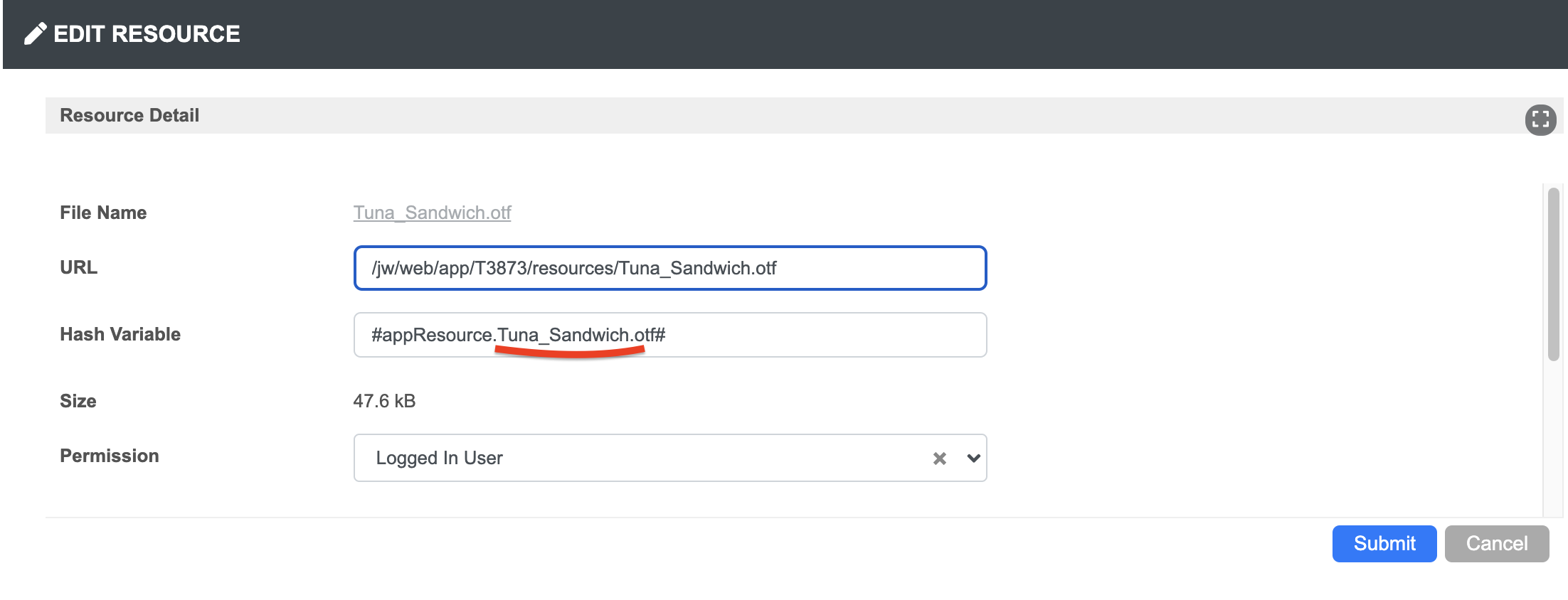 After uploading the font file, click on the resource to obtain the hash variable of the font. You can then reference the font file using its generated hash variable, which looks like this.