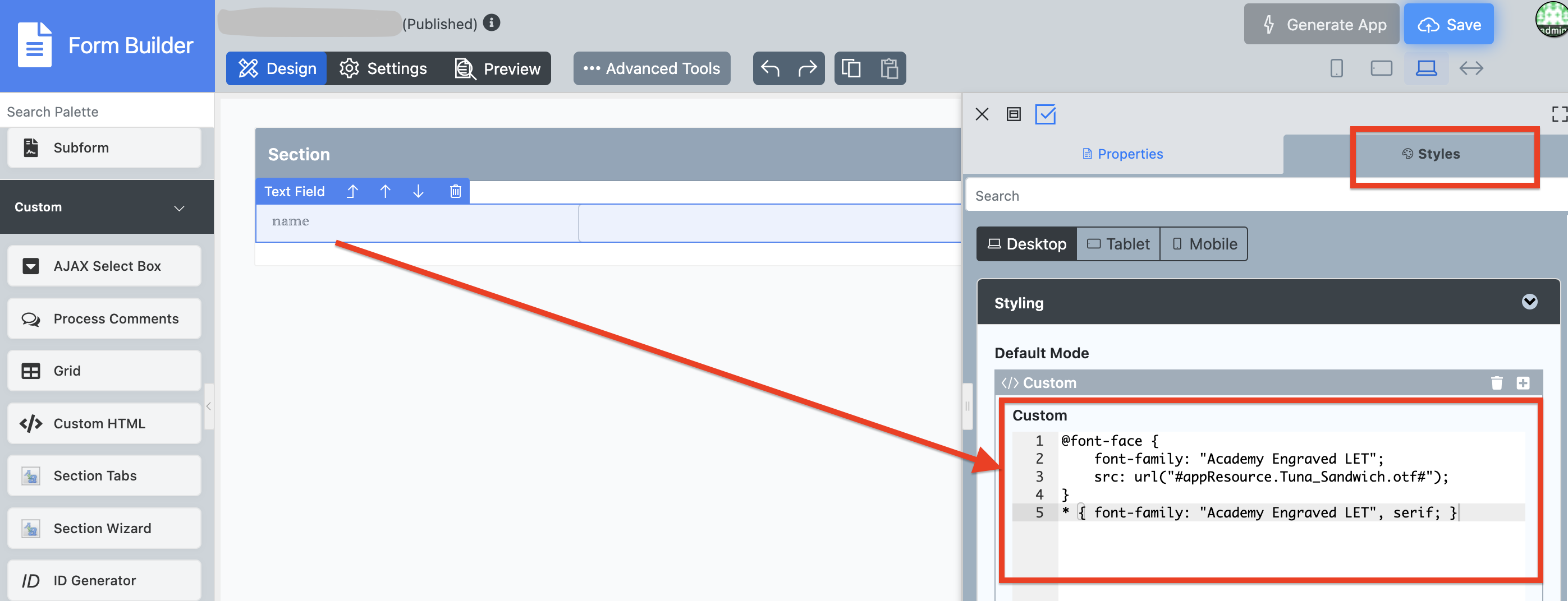 To implement this font inside a form, configure the styles section of the form, see Figure 4.