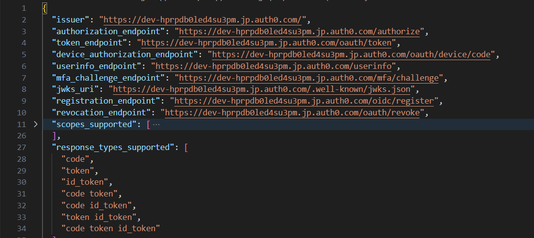 - Then, based on Okta documentation, we will need to go to the discovery URL to extract the necessary information. In my case, it is https://dev-hprpdb0led4su3pm.jp.auth0.com/.well-known/openid-configuration.