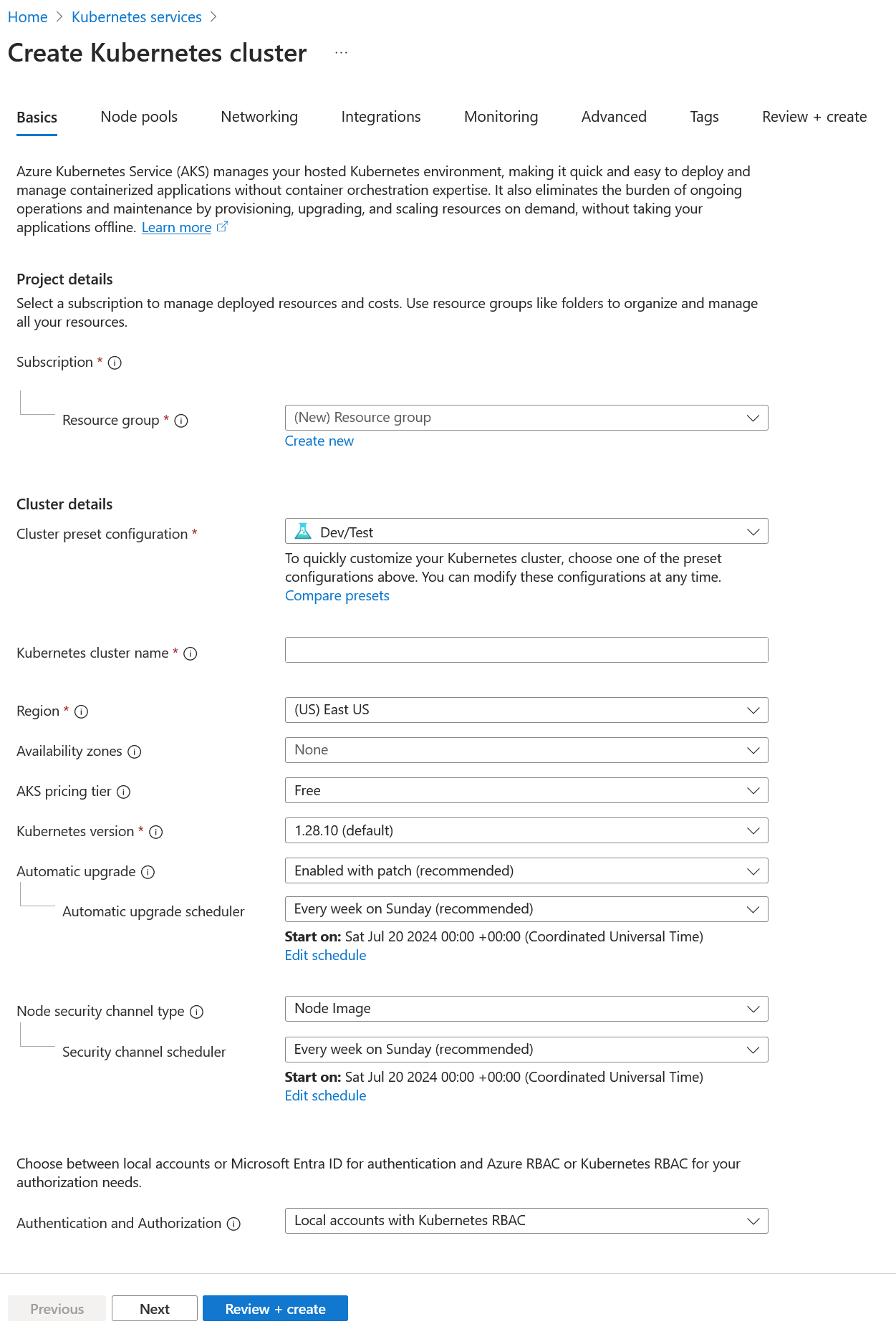 In the Basics page, choose the Subscription, Resource Group and input the Kubernetes cluster name. Adjust the other configuration settings as desired, or leave as default.