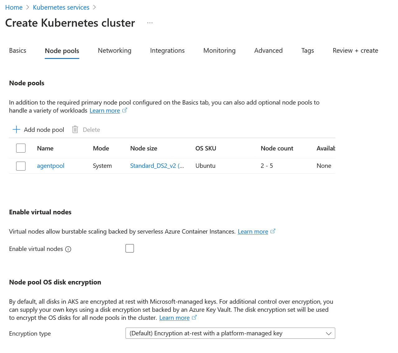 In the Node pools tab, you can configure to add node pools into the cluster. Read on multiple node pools in AKS. For this guide, we will use a single node configuration.