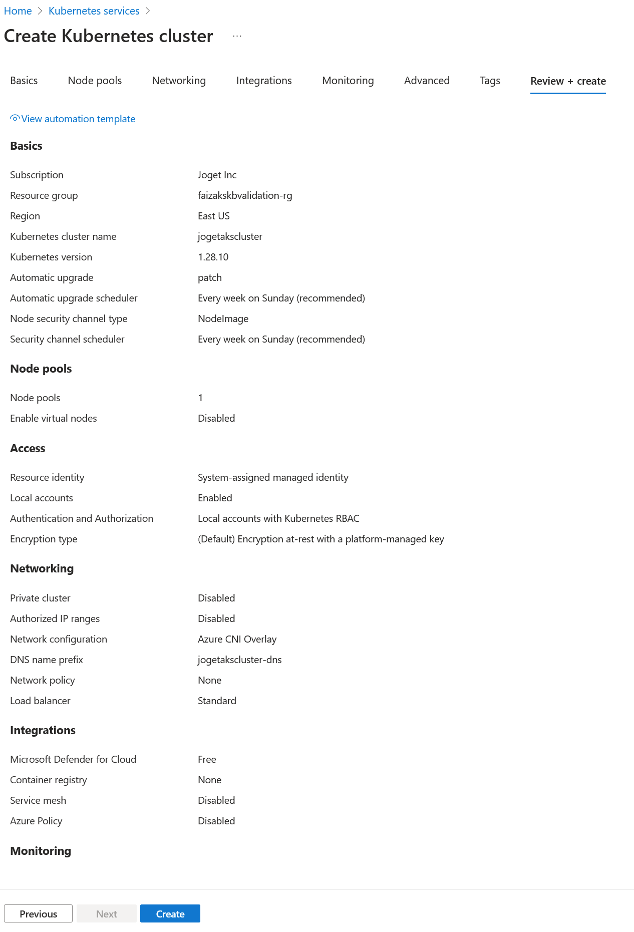 For other tab options - Access, Networking, Integrations, Advanced and Tags, you can leave the default options or make adjustments/changes as necessary. After that, you can click on the Review + create and deploy the Kubernetes cluster.
