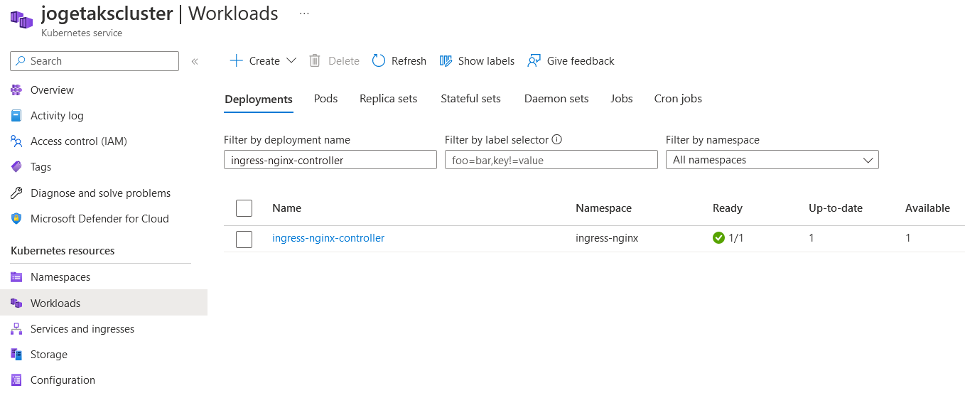 helm repo add ingress-nginx https://kubernetes.github.io/ingress-nginx helm repo update helm install ingress-nginx ingress-nginx/ingress-nginx --create-namespace --namespace nginx-ingress --set controller.service.annotations."service\.beta\.kubernetes\.io/azure-load-balancer-health-probe-request-path"=/healthz --set controller.service.externalTrafficPolicy=Local