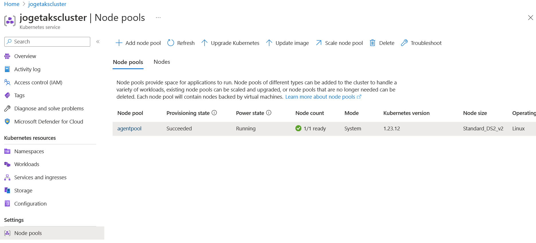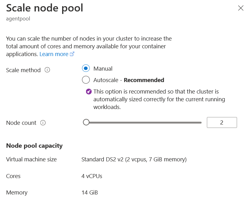 As for the node, you can scale the node count of the node pool from the Azure portal. Go to the Cluster in the Kubernetes service (in this guide example jogetakscluster) > Settings > Node pools. Select the node pool and then click on the Scale node pool. Choose Manual as the Scale method and input the desired node count (maximum available resource is based on the VM size that you have chosen).