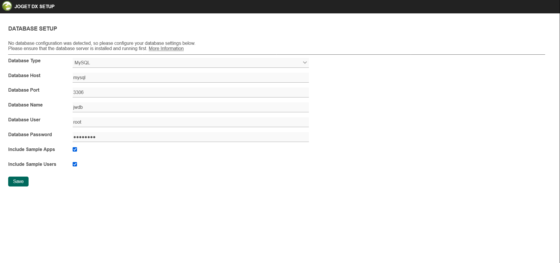 To complete the Joget deployment, you need to perform a one-time Database Setup. Key in the MySQL service name and the Database Username and Password. Click on Save.