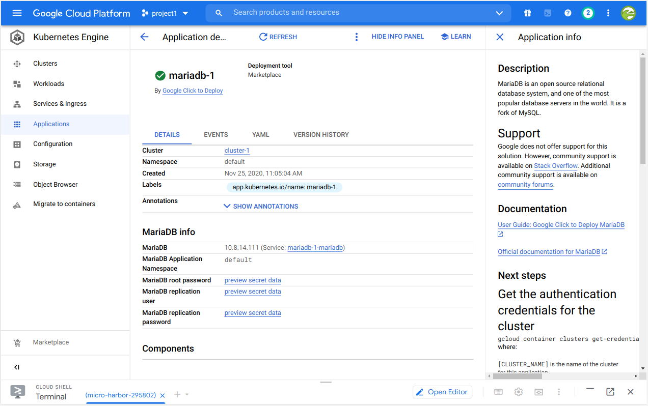 Once the status is OK, click on the name and view the details. Under Details, look for MariaDB root password and click on preview secret data.