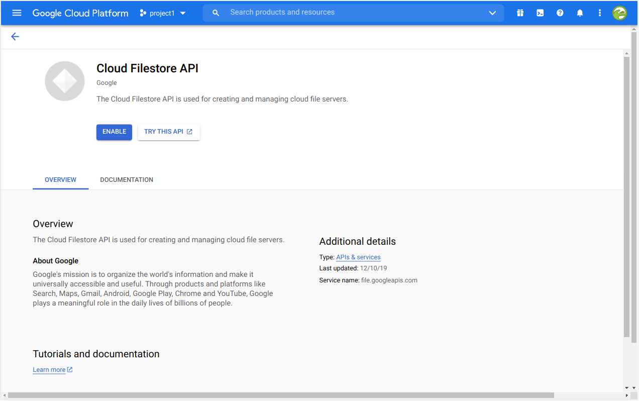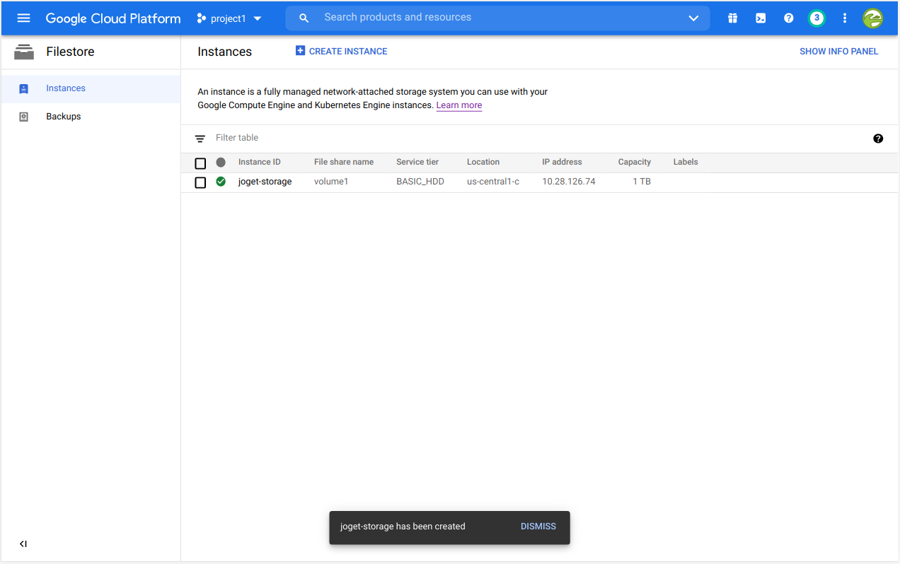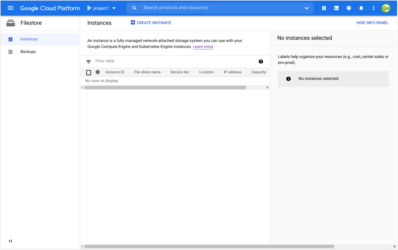 Access the Google Cloud Filestore console. The first time you access it, you will need to click on the Enable button.