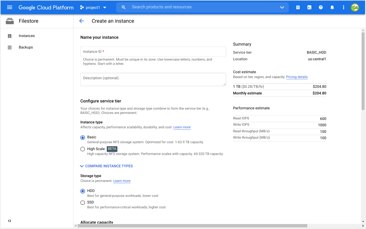 Key in an Instance ID, File share name and Region/Zone, then click on the Create button.