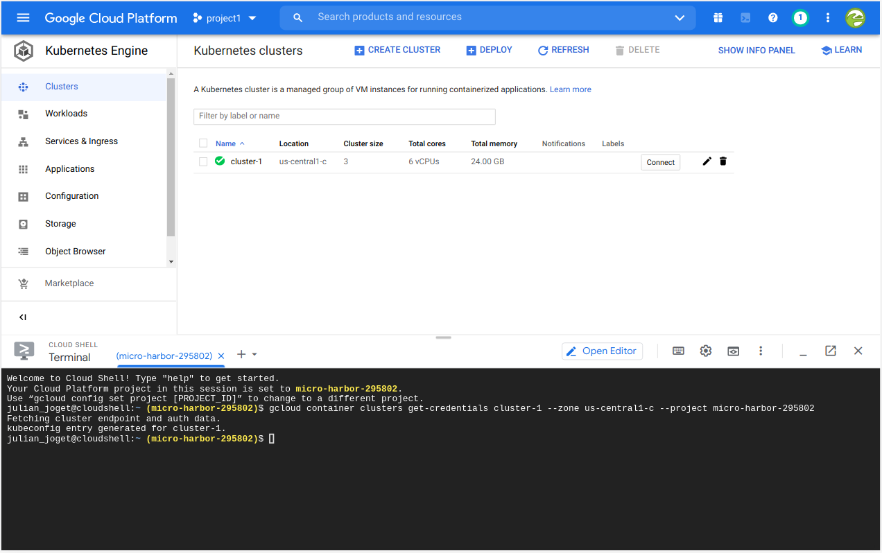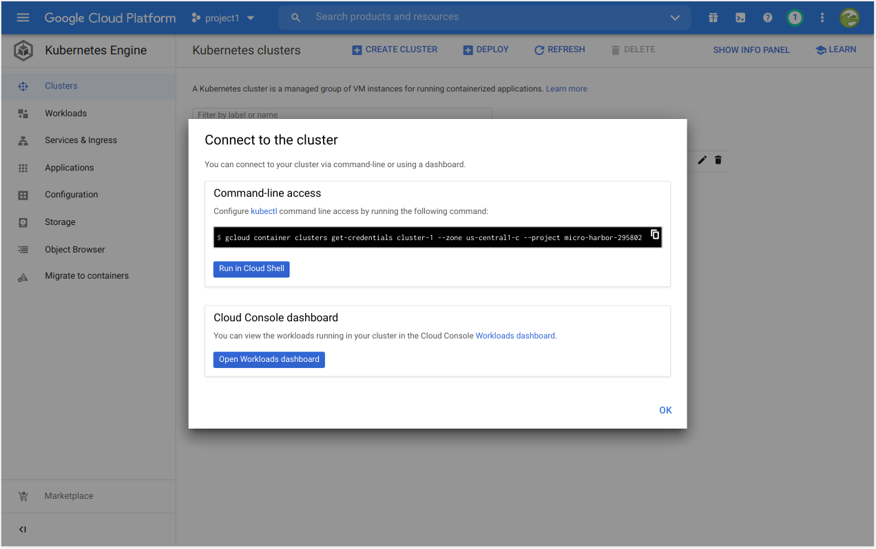 In the GKE Clusters page, click on the Connect button for your cluster, then Run in Cloud Shell.
