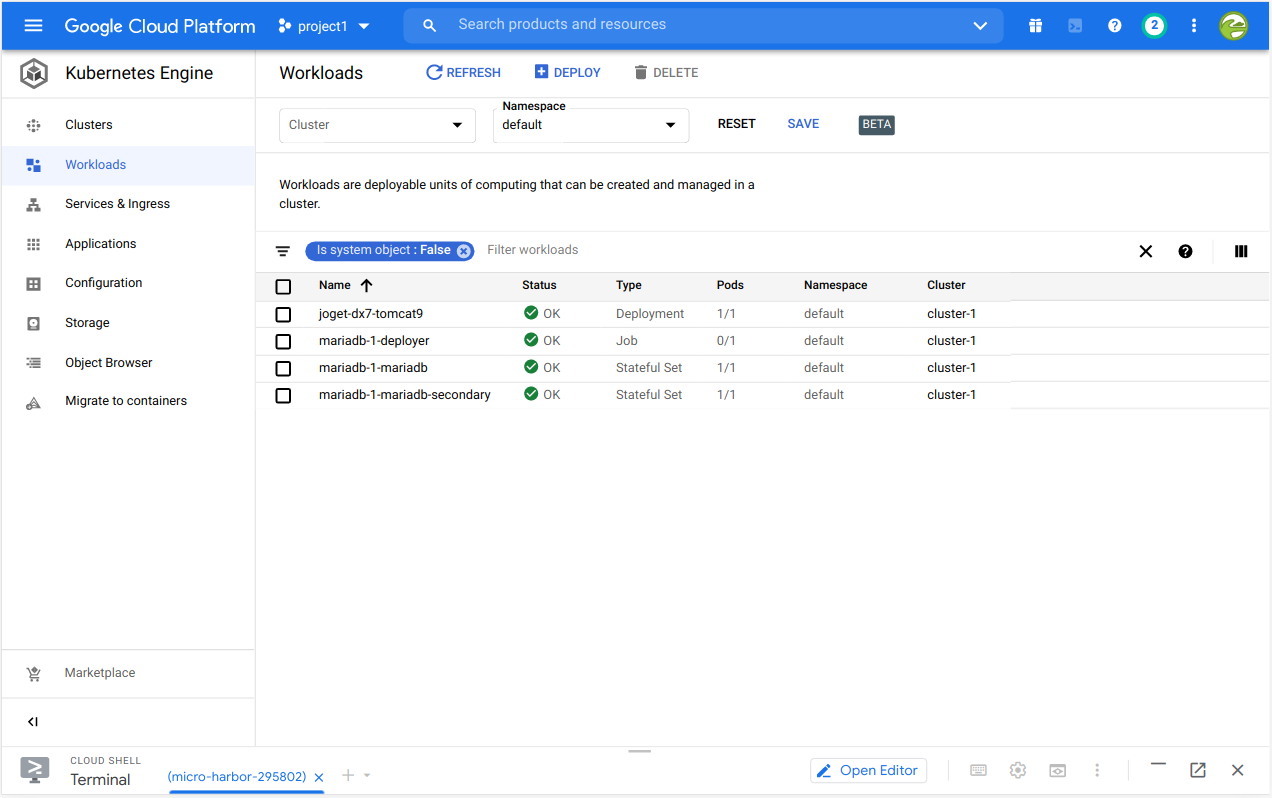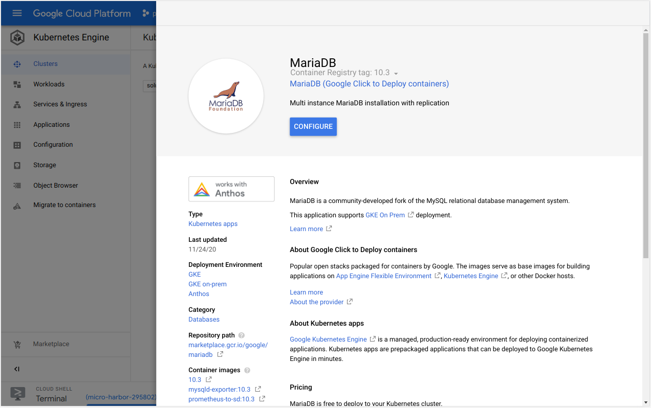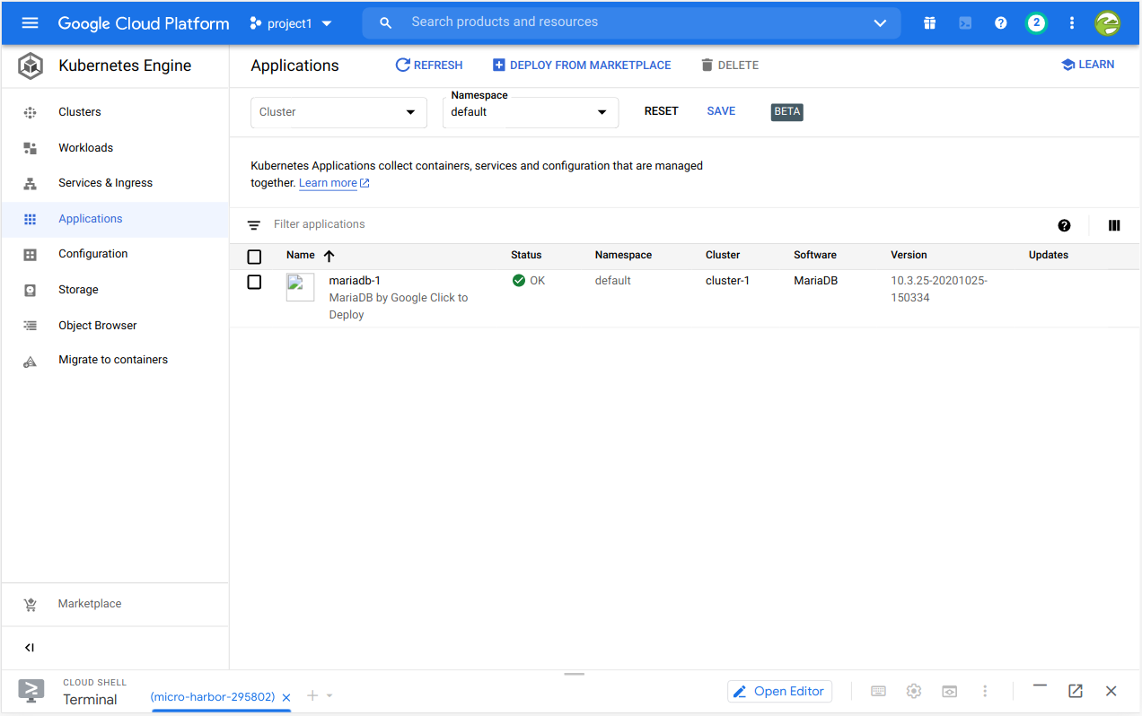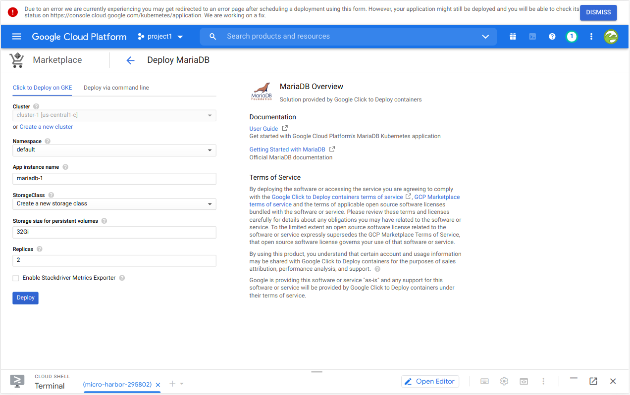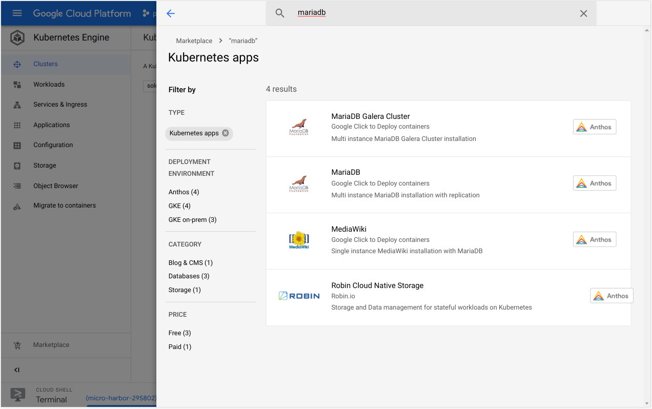Once we have a running cluster, you will need to deploy a database to be used by the Joget platform. In this case, we will use a MariaDB database that is available in the Google Cloud Marketplace.