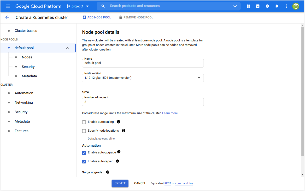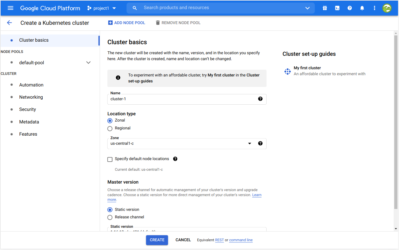 In the Cluster basics page, you can configure the name, zone and Kubernetes version for the cluster.