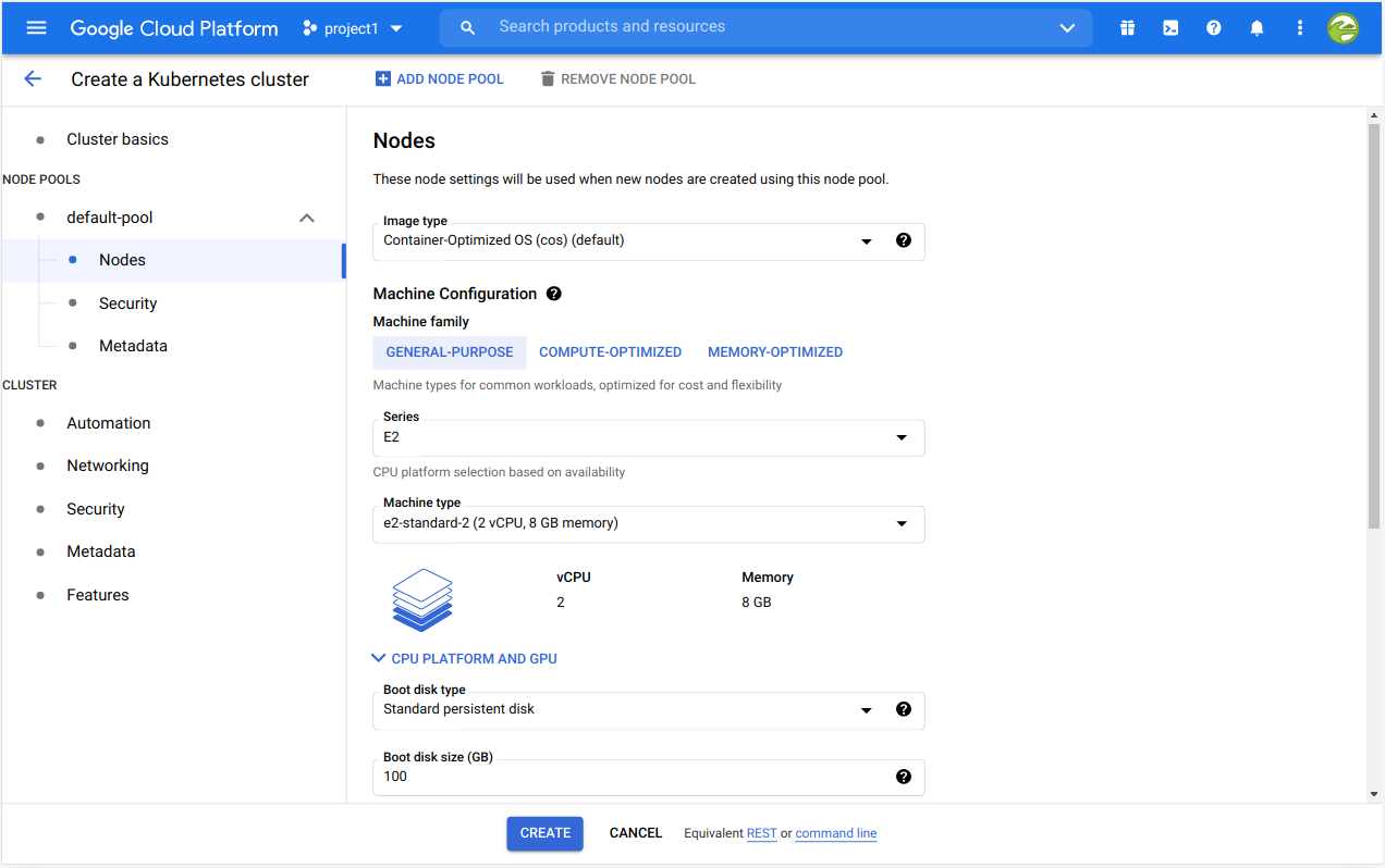 Under the Nodes page, you can choose the machine configuration to specify the machine type, CPU and disk options.