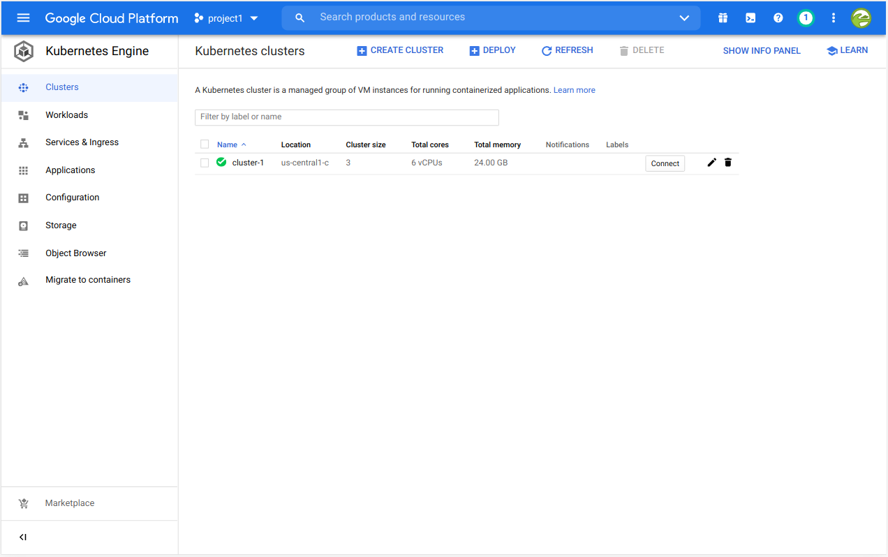 When the cluster has been created, you will see a tick next to the cluster name, and a Connect button will become available.