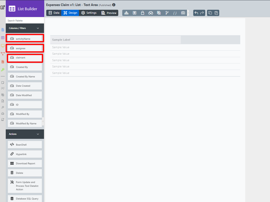 Next, add in the columns intended, and most importantly, add "activityName" and "assignee" to reveal the pending activity and assignees.