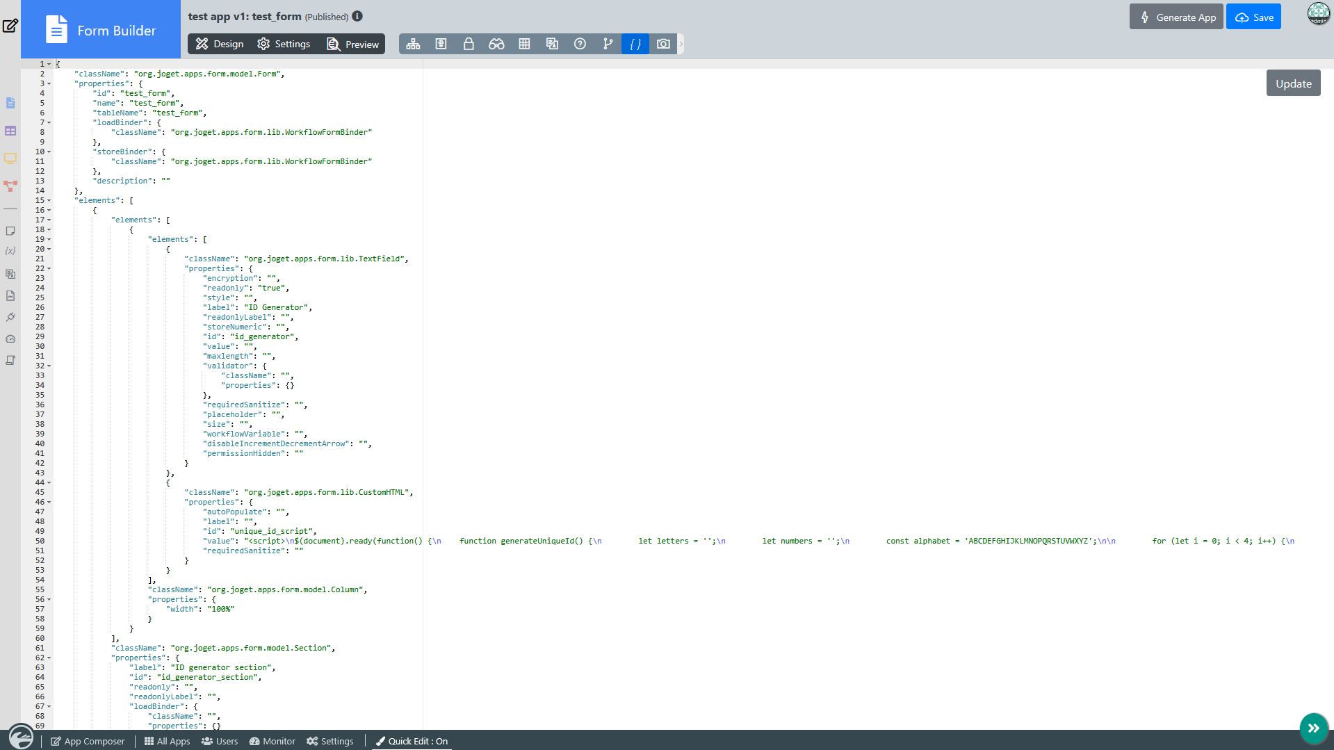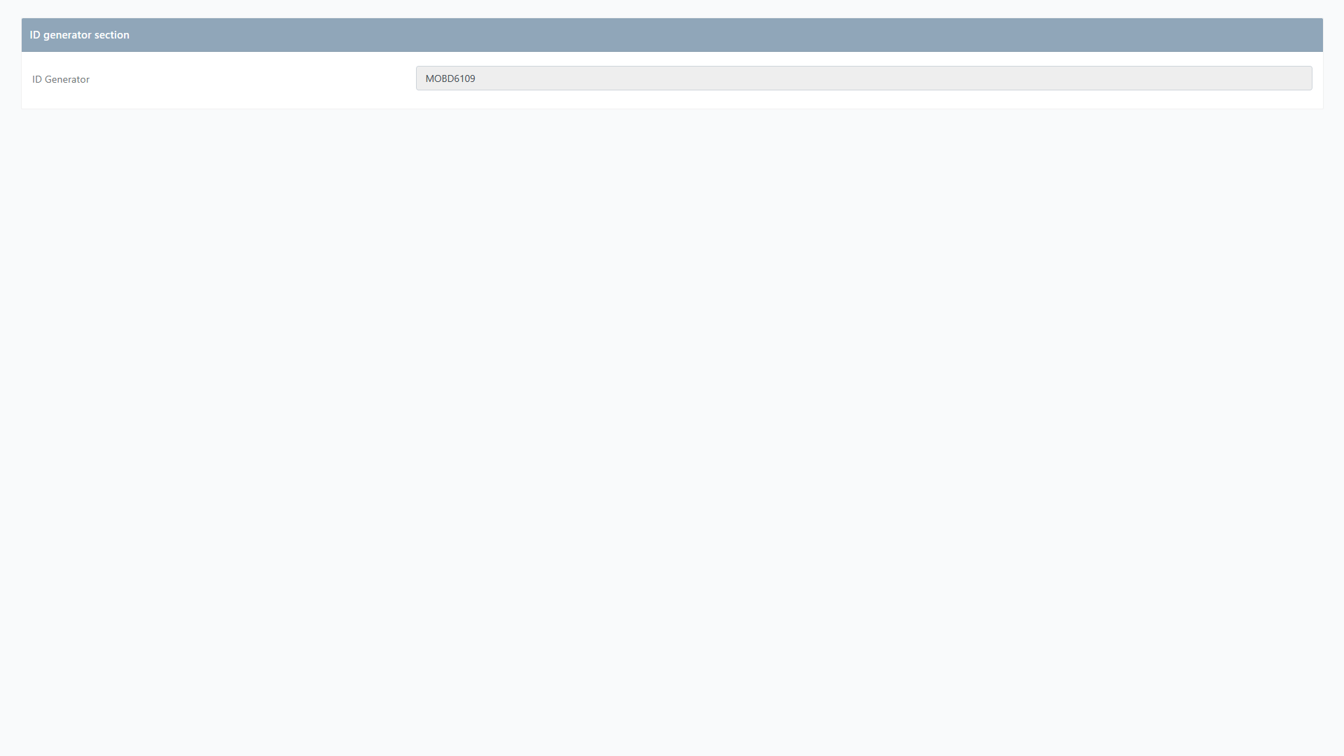 { "className": "org.joget.apps.form.lib.TextField", "properties": { "encryption": "", "readonly": "true", "style": "", "label": "ID Generator", "readonlyLabel": "", "storeNumeric": "", "id": "id_generator", "value": "", "maxlength": "", "validator": { "className": "", "properties": {} }, "requiredSanitize": "", "placeholder": "", "size": "", "workflowVariable": "", "disableIncrementDecrementArrow": "", "permissionHidden": "" } }, { "className": "org.joget.apps.form.lib.CustomHTML", "properties": { "autoPopulate": "", "label": "", "id": "unique_id_script", "value": "<script>\n$(document).ready(function() {\n function generateUniqueId() {\n let letters = '';\n let numbers = '';\n const alphabet = 'ABCDEFGHIJKLMNOPQRSTUVWXYZ';\n\n for (let i = 0; i < 4; i++) {\n letters += alphabet.charAt(Math.floor(Math.random() * alphabet.length));\n }\n\n for (let i = 0; i < 4; i++) {\n numbers += Math.floor(Math.random() * 10);\n }\n\n return letters + numbers;\n }\n\n setTimeout(function() {\n var $field = $('#id_generator');\n if ($field.length && $field.val().trim() === '') {\n $field.val(generateUniqueId());\n }\n }, 500);\n});\n</script>", "requiredSanitize": "" } }