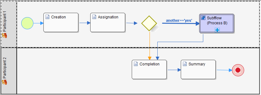 - Start subflow/subprocess (Process B) with actual parameter/WF variable (statusA)