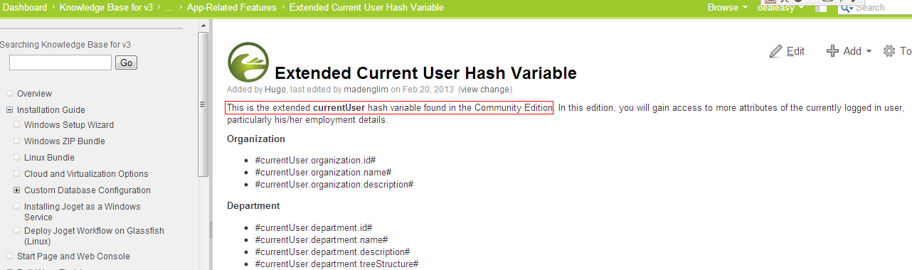 I found that the knowledge base in v3 community edition, it support Extended Current User Hash Variable. please see the pic.