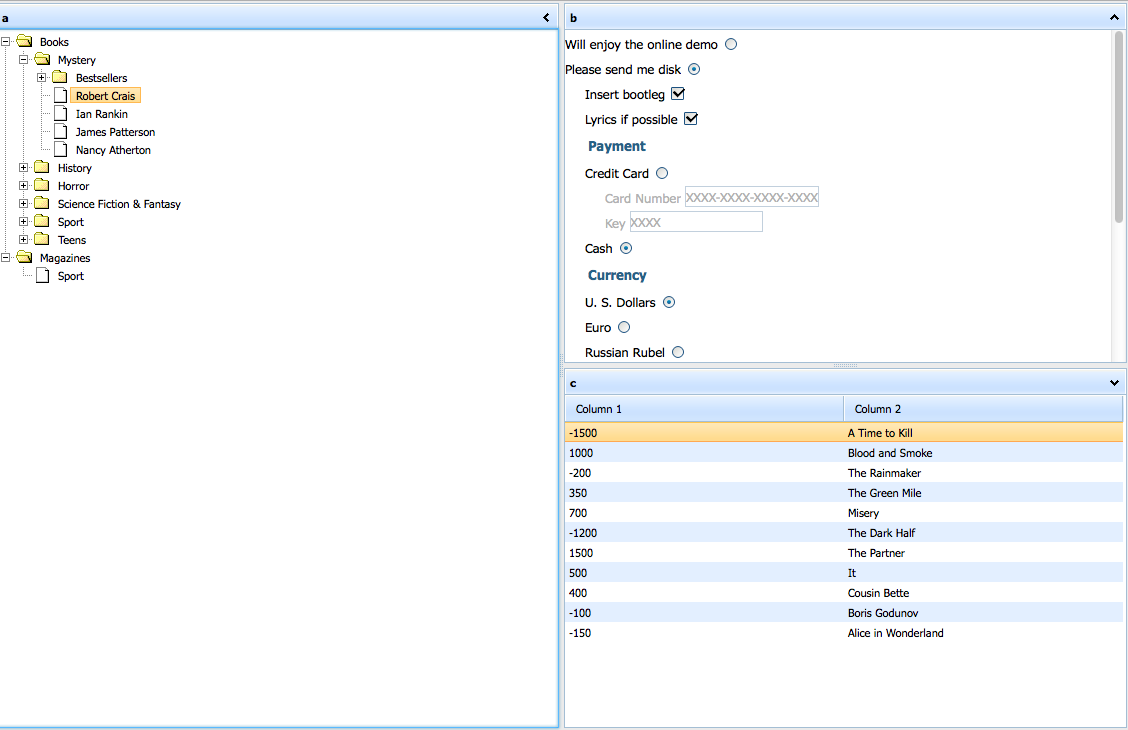 What I would like to achieve is a custom layout component that allows you to combine different components into a single application interface, placing different types of content on one page. For example a treeview (a) component in combination with a form (b) and data list (c). See screen shot.