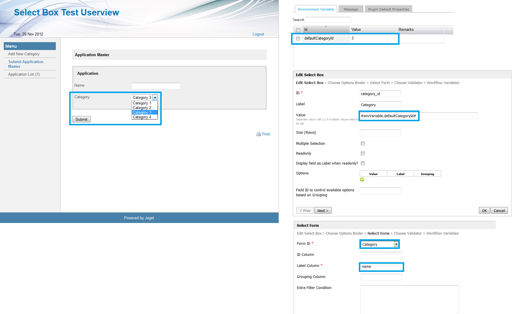 4. Click on the second item in the Userview. You will see a form with a subform inside. In the subform, you will find a Select Box with its options loaded from categories added earlier. The default value of the Select Box is read from Environment Variable "defaultCategoryId" with its value set as 3. Fill up the form, pick different category and submit.