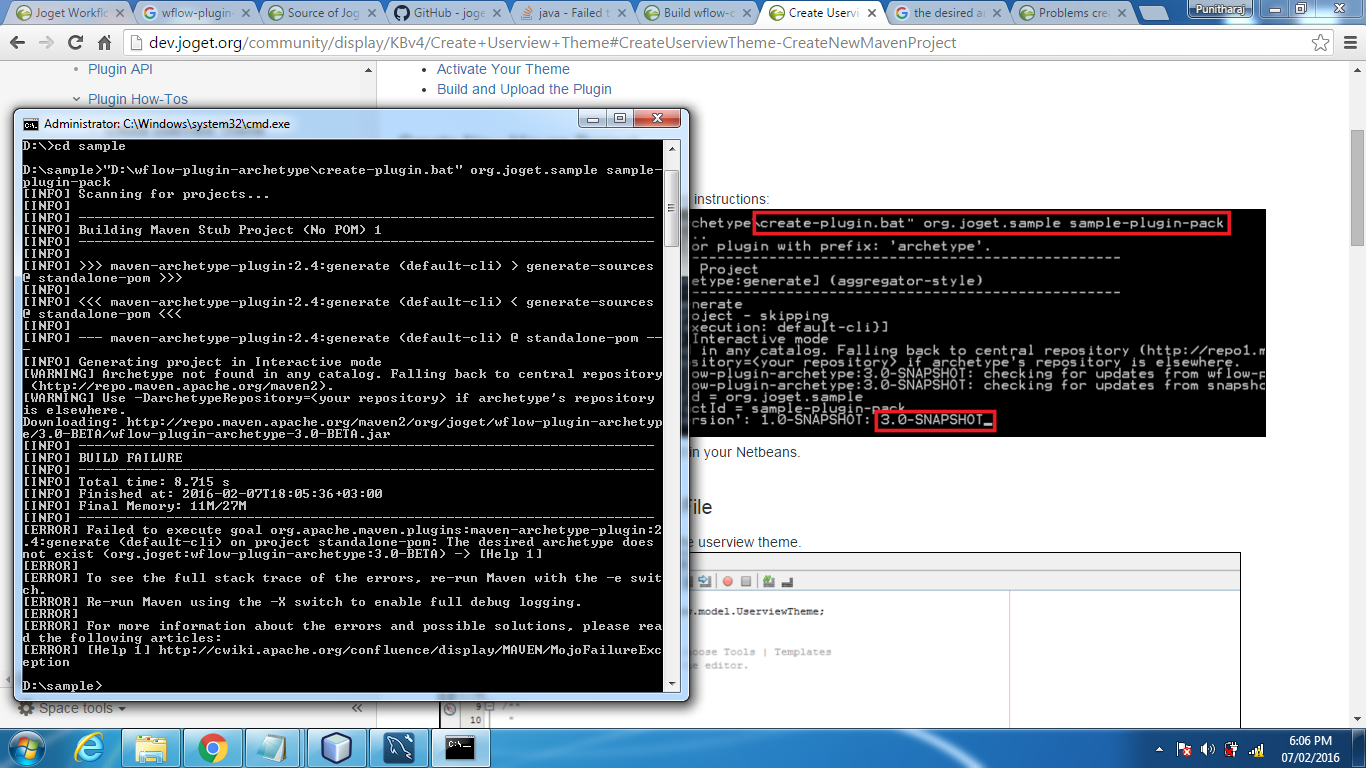 D:\Projects\JoGet_v3\wflow-plugins>..\wflow-plugin-archetype\create-plugin.bat com.company.plugin.test TestPlugin [INFO] Scanning for projects... [INFO] Reactor build order: [INFO] wflow-plugin-beanshell [INFO] wflow-plugin-email [INFO] wflow-plugin-formDataEtl [INFO] wflow-plugin-json [INFO] wflow-plugin-report [INFO] wflow-plugin-userNotification [INFO] wflow-plugins [INFO] wflow-plugin-referenceId [INFO] wflow-plugin-mysql [INFO] Searching repository for plugin with prefix: 'archetype'. [INFO] ------------------------------------------------------------------------ [INFO] Building wflow-plugins [INFO] task-segment: [archetype:generate] (aggregator-style) [INFO] ------------------------------------------------------------------------ [INFO] Preparing archetype:generate [INFO] No goals needed for project - skipping [INFO] [archetype:generate {execution: default-cli}] [INFO] Generating project in Interactive mode [WARNING] Archetype not found in any catalog. Falling back to central repository (http://repo1.maven.org/maven2). [WARNING] Use -DarchetypeRepository=<your repository> if archetype's repository is elsewhere. [INFO] snapshot org.joget:wflow-plugin-archetype:2.0-SNAPSHOT: checking for updates from wflow-plugin-archetype-repo Downloading: http://repo1.maven.org/maven2/org/joget/wflow-plugin-archetype/2.0-SNAPSHOT/wflow-plugin-archetype-2.0-SNAPSHOT.jar [INFO] Unable to find resource 'org.joget:wflow-plugin-archetype:jar:2.0-SNAPSHOT' in repository wflow-plugin-archetype-repo (http://repo1.maven.org/maven2) [INFO] ------------------------------------------------------------------------ [ERROR] BUILD FAILURE [INFO] ------------------------------------------------------------------------ [INFO] The desired archetype does not exist (org.joget:wflow-plugin-archetype:2.0-SNAPSHOT) [INFO] ------------------------------------------------------------------------ [INFO] For more information, run Maven with the -e switch [INFO] ------------------------------------------------------------------------ [INFO] Total time: 3 seconds [INFO] Finished at: Mon Sep 19 17:35:24 AST 2011 [INFO] Final Memory: 18M/43M [INFO] ------------------------------------------------------------------------