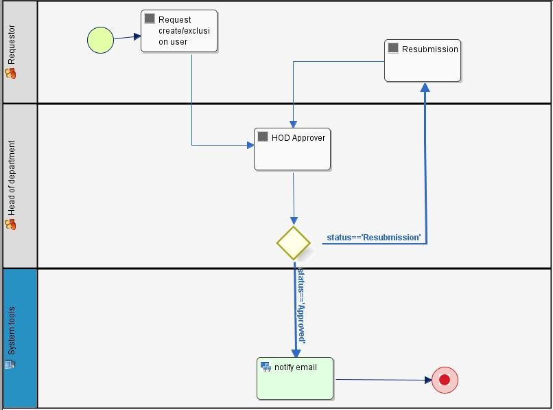 I attached drawing the diagram of the workflow. The Workflow is to control creation/exclusion of users.