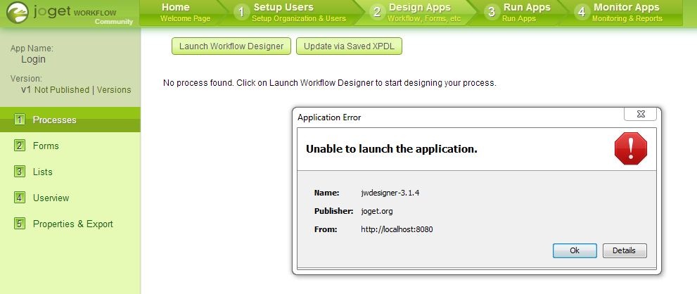 I am new in using Joget v-3 in windows7. The installation is complete and smooth till I want to launch workflow designer.