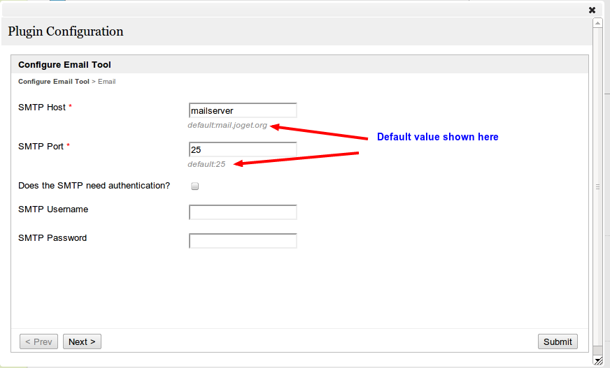 Please see the images below. The default value will show under the input field after you set plugin default properties. If you leave the input field empty, then the system will use the default value as you configure.