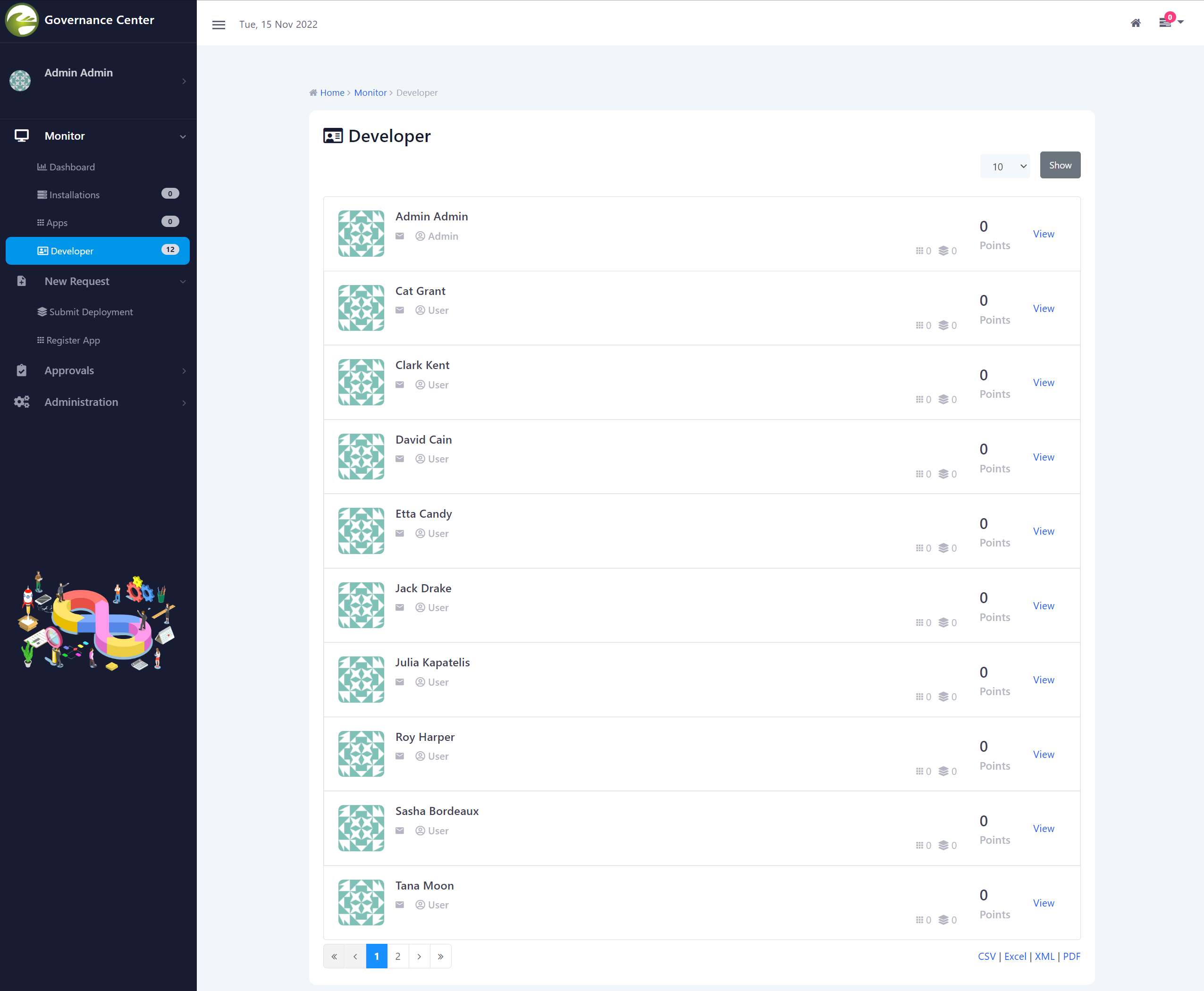 Developer shows a list of developers and their roles, number of deployments, and number of application contributions.