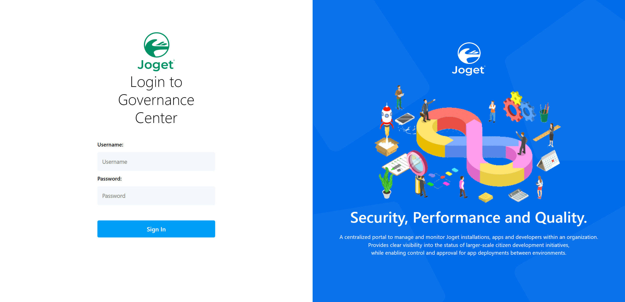 The Governance Center is a customizable Joget DX 8 app that acts as a centralized portal to manage and monitor Joget installations, apps, and developers within an organization. This will provide a clear visibility into the status of larger-scale citizen development initiatives.