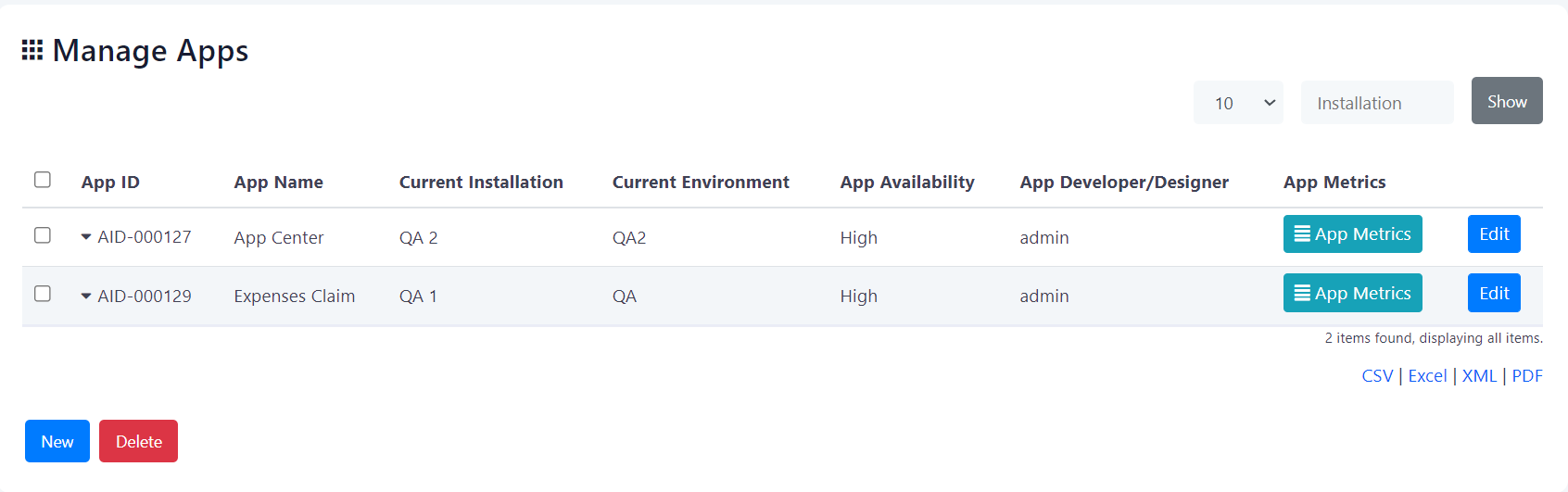 App Name | Application Name shows a list of applications that are available on the installation. |