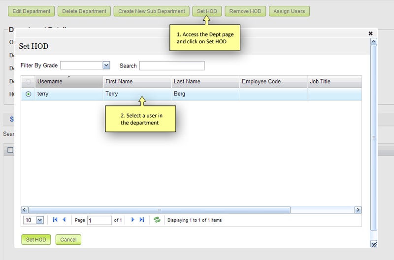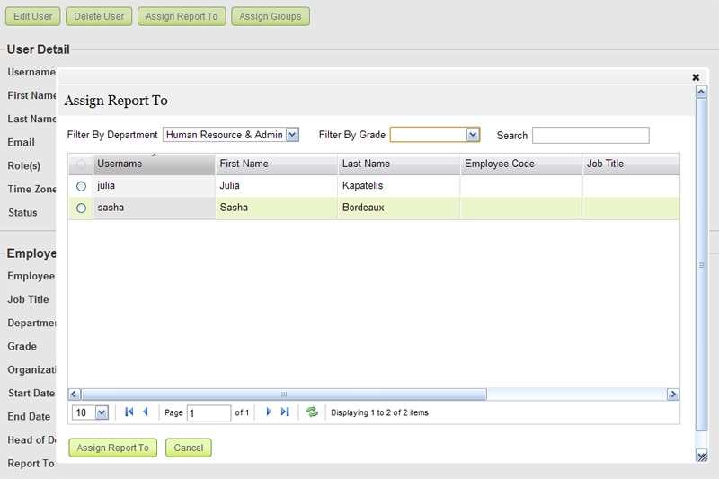 In addition to HOD, you can also set a direct superior/supervisor to a specific user. To do this, access the user account (Setup Users > Setup Users > click on a user > click on Assign Report To). Once there, a popup window should appear allowing you to filter users by Departments and Grades. Note that the listing that appears is specifically limited to the data within the organization of the selected user.