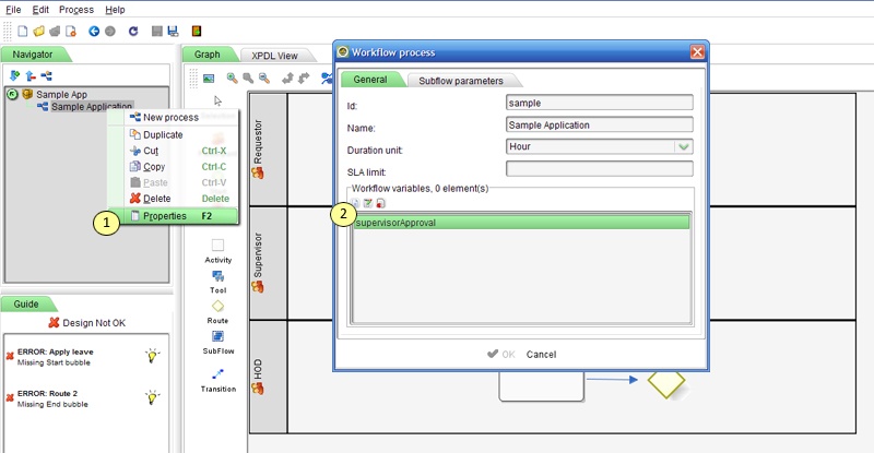 On the other hand, when the supervisor decides to accept/reject a leave application, the course of process flow is altered, causing activities to be launched and decisions to be activated. Thus, in our sample process, the variable "supervisorApproval" will have to be a workflow variable.