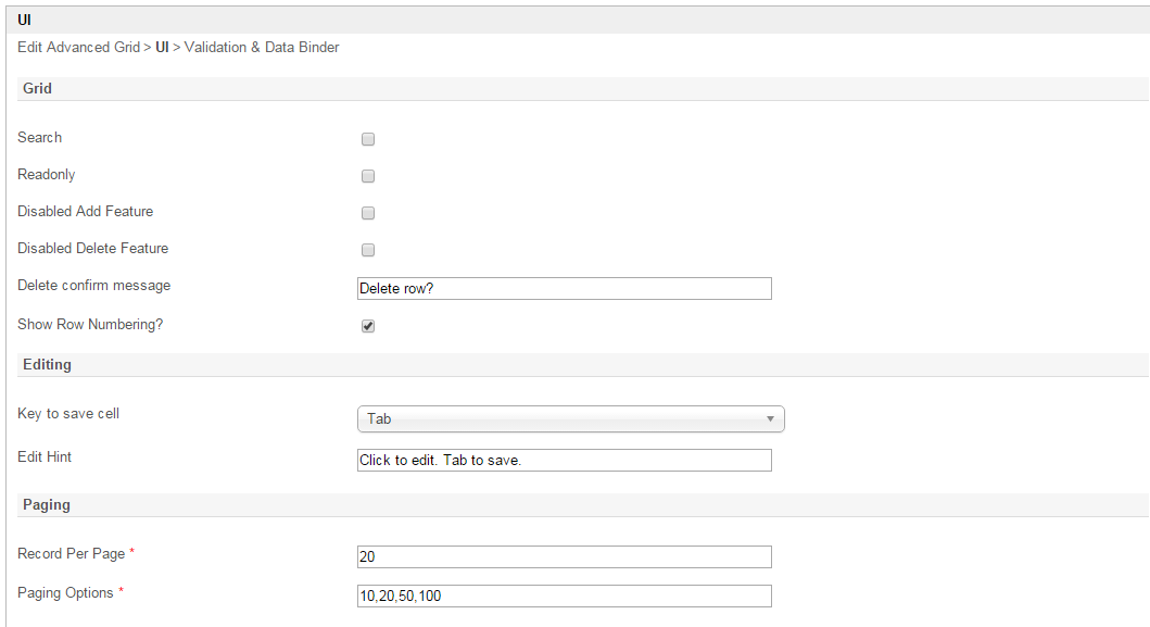 Figure 7: Advanced Grid Properties - Validation & Data Binder