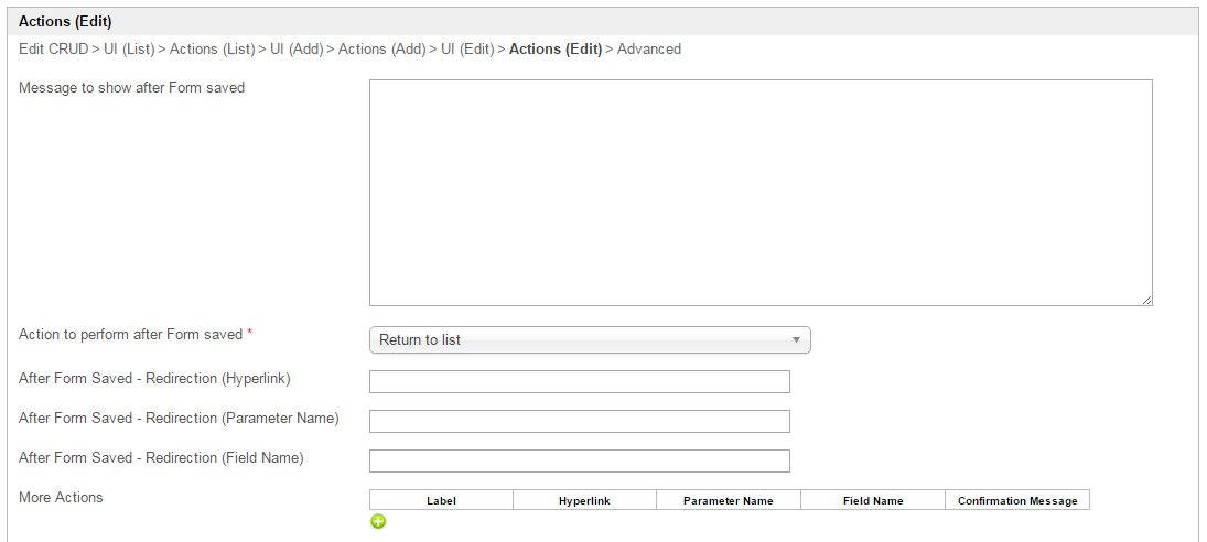After Form Saved - Redirection (Parameter Name) | Parameter to be included. Only applicable when Action to perform after Form saved is set to Redirection. | ||||||||||||