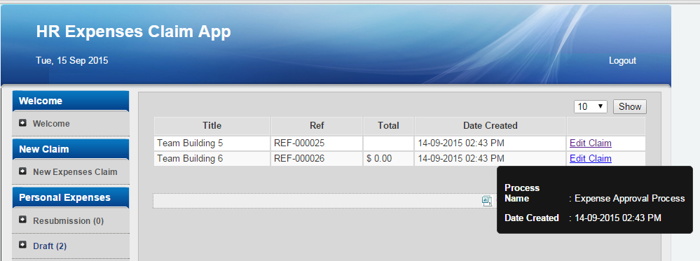 Figure 1: Screenshot showing Data List Inbox from sample HR Expenses Claim app