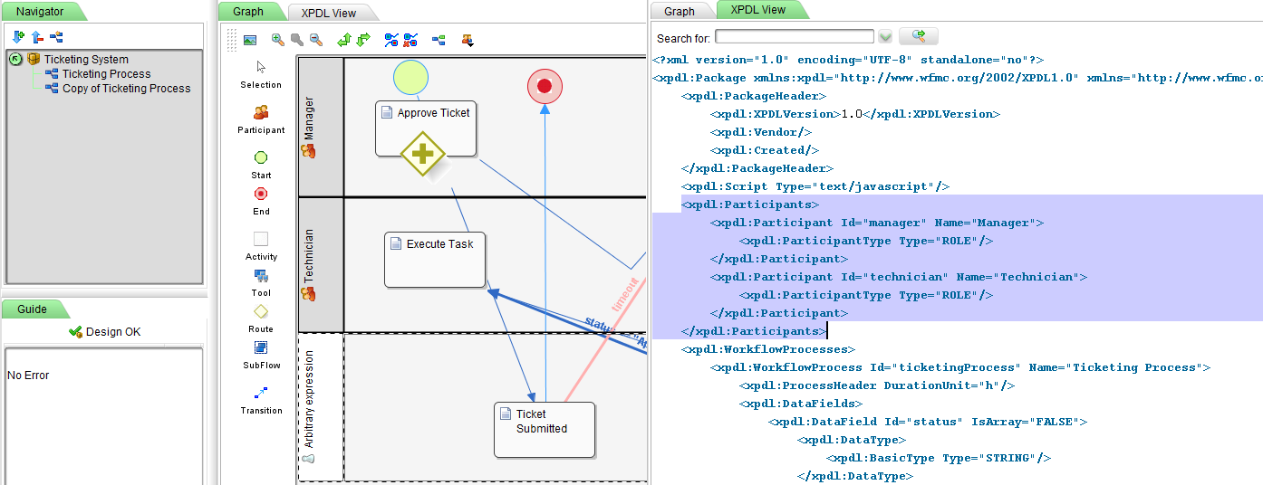 - Create new participant, locate the activities that use the old participant in the XPDL view and do a search and replace in your favourite text editor.