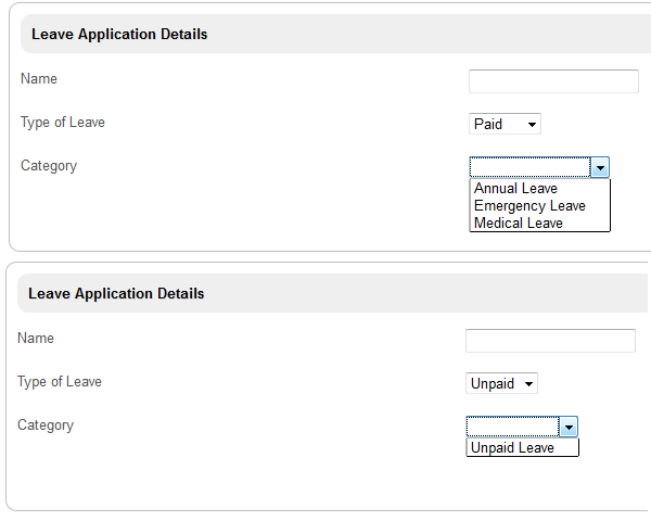 In the example shown below, the "Category" select box is based on the type of leave designated in the Type of Leave field.