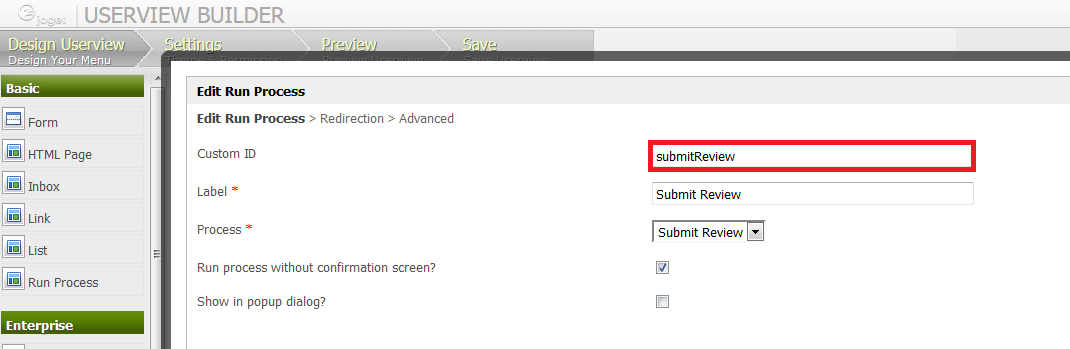Figure 1: Assign Custom ID in Run Process element in Userview Builder