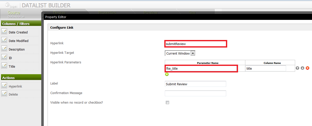 In the "Hyperlink Parameters", key in the corresponding parameter name with the matching field ID. (E.g. In the form, it has a field called "title"). Remember to add in the prefix "fk_" or "fke_" to the parameter name. The latter one is used as a flag to allow the field to be edited.