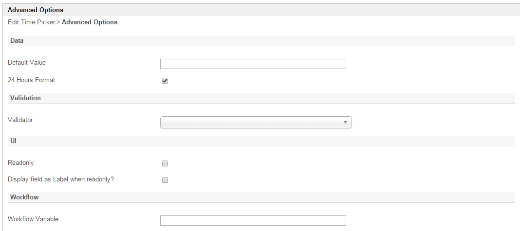 Workflow Variable | If the form is part of a workflow process, upon saving of the form (by clicking on "Save as Draft" or "Complete" button). The value in this input field will be saved into the corresponding workflow variable named here. Using a non-existent Workflow Variable name You will get the following warning with the name printed out (e.g. status) in the server log if you attempt to map to a non-existent Workflow Variable. context attribute status does not exist in process context - adding new attributes to the process context is not allowed |