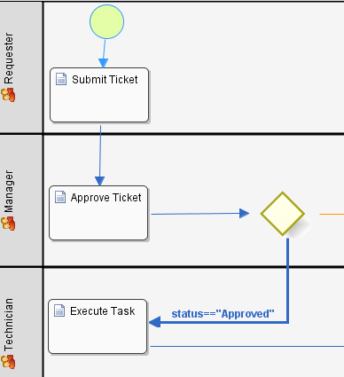 Usually, we design a process to solve the main business problem, like in the example shown below. We exclude explicit tools for sending out email notifications to avoid complicating the process flow design.