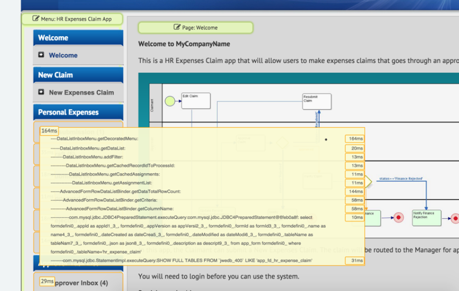 The Performance Analyzer is a new feature in Joget Workflow v5 Enterprise Edition that allows administrators and app designers to analyze the performance of their apps and to identify possible bottlenecks.