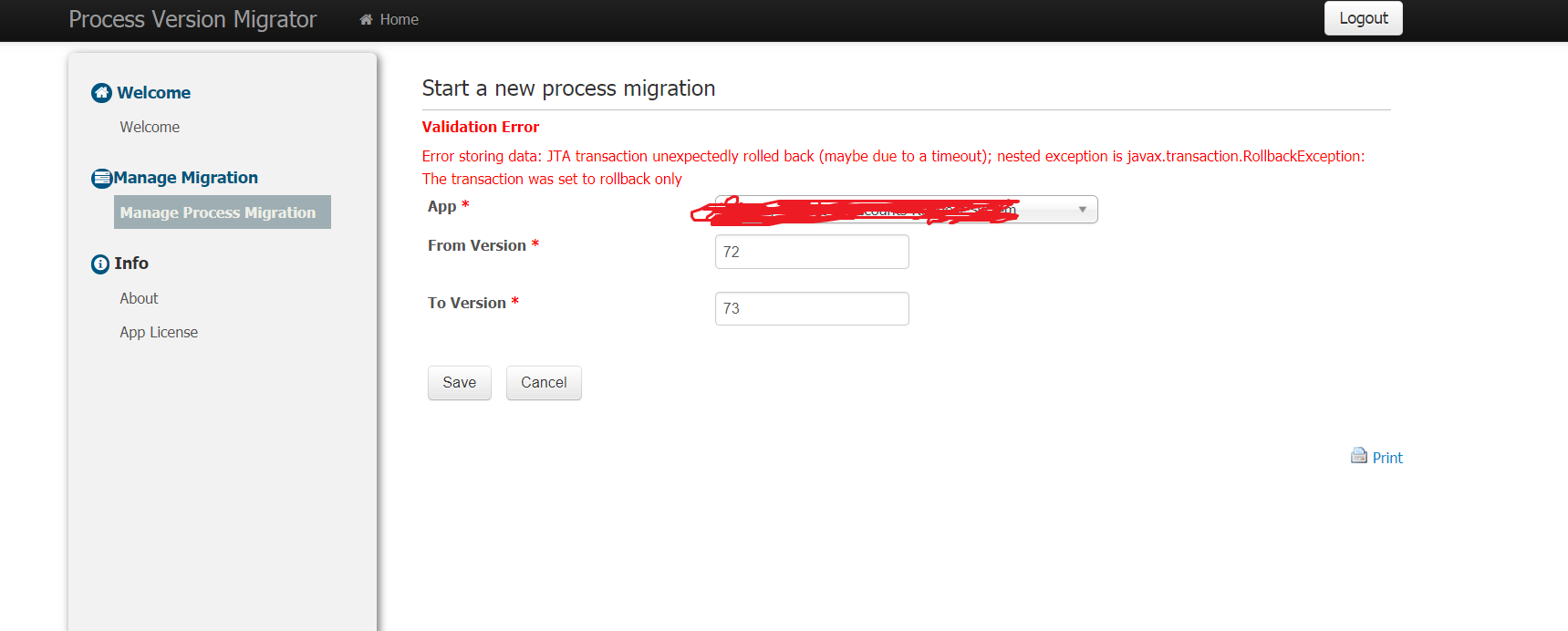 You received the error "JTA transaction unexpectedly rolled back (maybe due to a timeout);" likely due to too many processes to migrate and the processing time exceeded the database transaction timeout max limit.