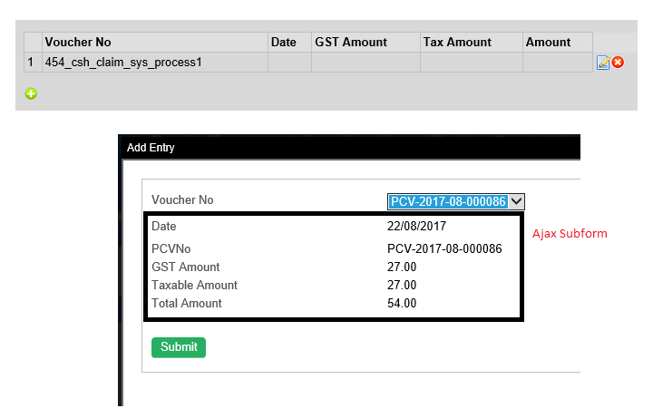 4 ) But, the moment I click submit in Form B. voucherNo is populated in form grid with the ID instead of the value. The other columns (Date, GSTAmount,TaxAmount,Amount) remains empty. But, when I view the form B, all the fields are filled up.