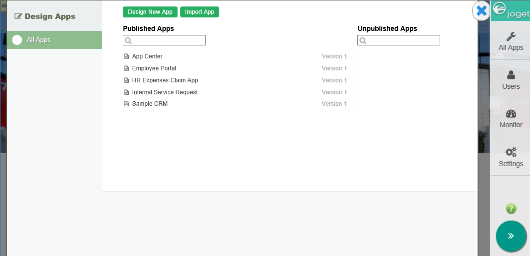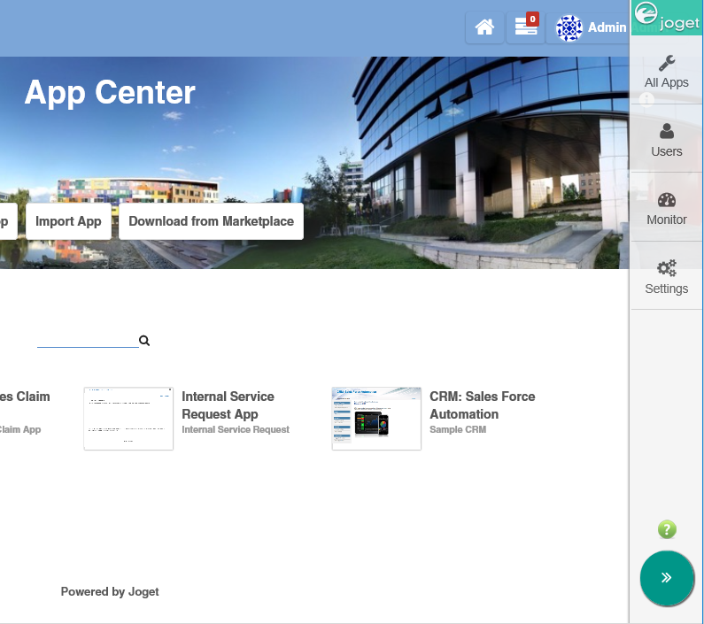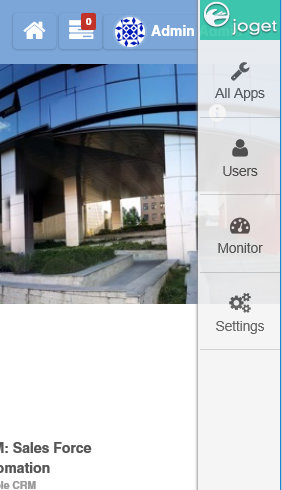 - At any time, clicking on the Joget logo on the top right will bring you back to the App Center, while clicking on any of the other buttons will open an overlay over the current window.