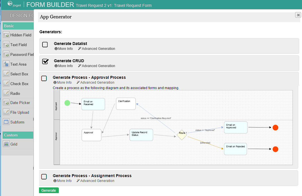 2. The App Generator dialog will offer options to Generate Datalist, Generate CRUD and Generate Approval Process and Generate Assignment Process. Select the first 3 and click on Generate. You may try to click on Advanced Generation to refine its options.