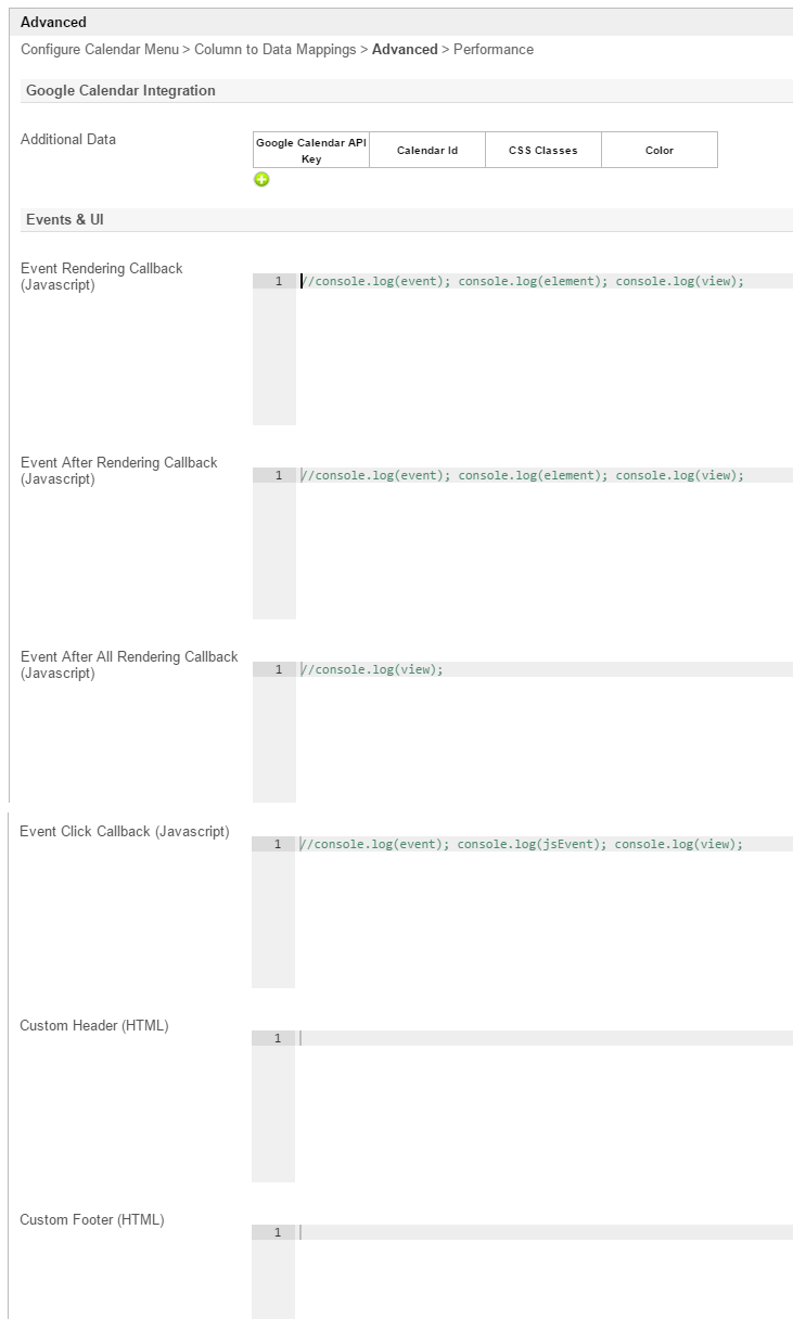 Google Calendar Integration - Additional Data | Configurations to load calendar entries from Google Calendar. Notes if you want the Calendar Menu plugin to connect to Google Calendar