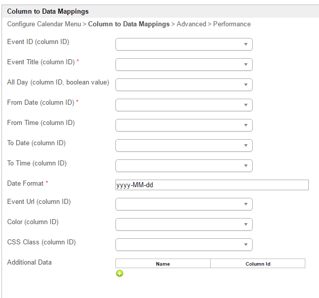 Event ID (column ID) | Defines individual calendar entry ID. Form field ID is expected here. |