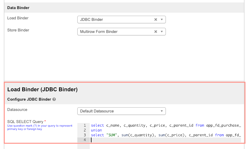 select c_name, c_quantity, c_price, c_parent_id from app_fd_purchase_items where c_parent_id = ? union select "SUM", sum(c_quantity), sum(c_price), c_parent_id from app_fd_purchase_items where c_parent_id = ?